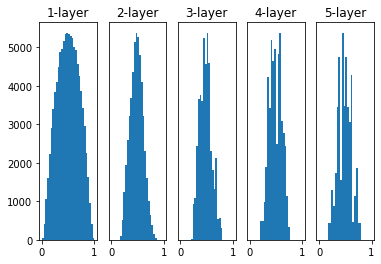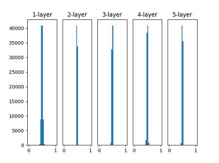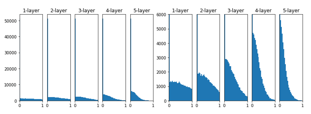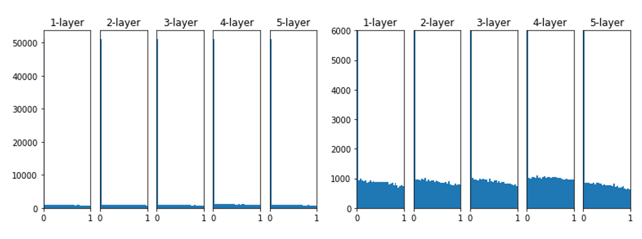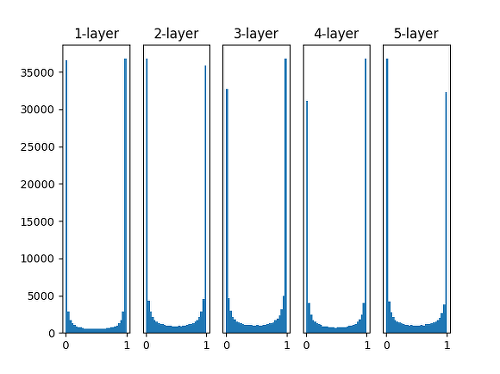 표준편차 1로 학습했을 떄, layer가 깊어질 수록 치우치는 모습