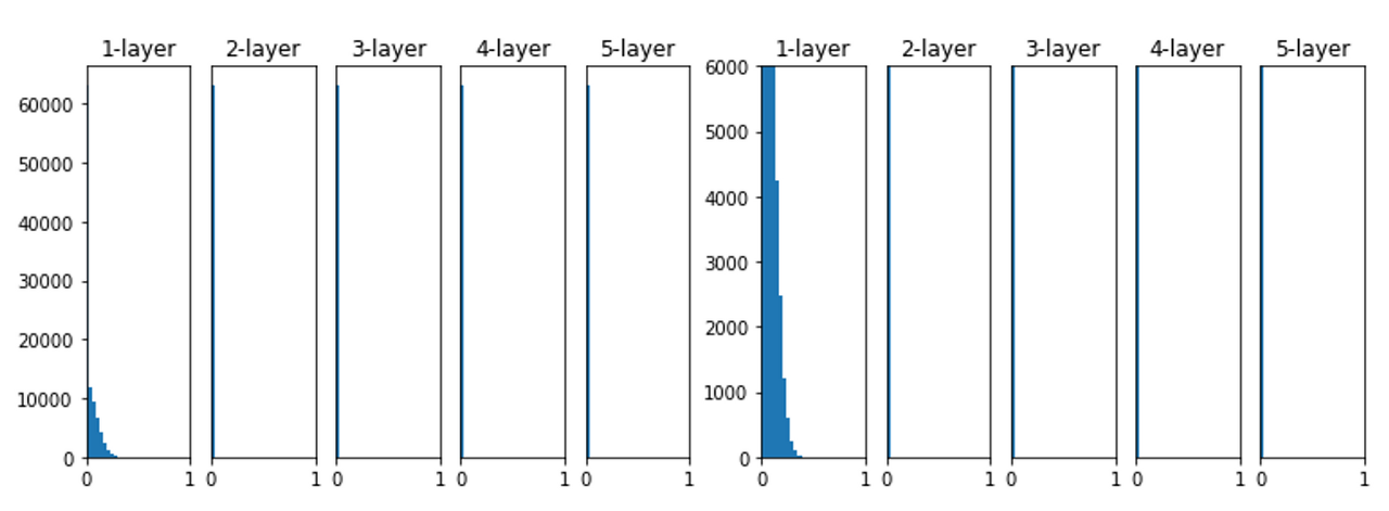 입력 계층이 여러 layer를 지날수록 점점 0에 가깝게 변하며, 값이 0이 되는 순간
